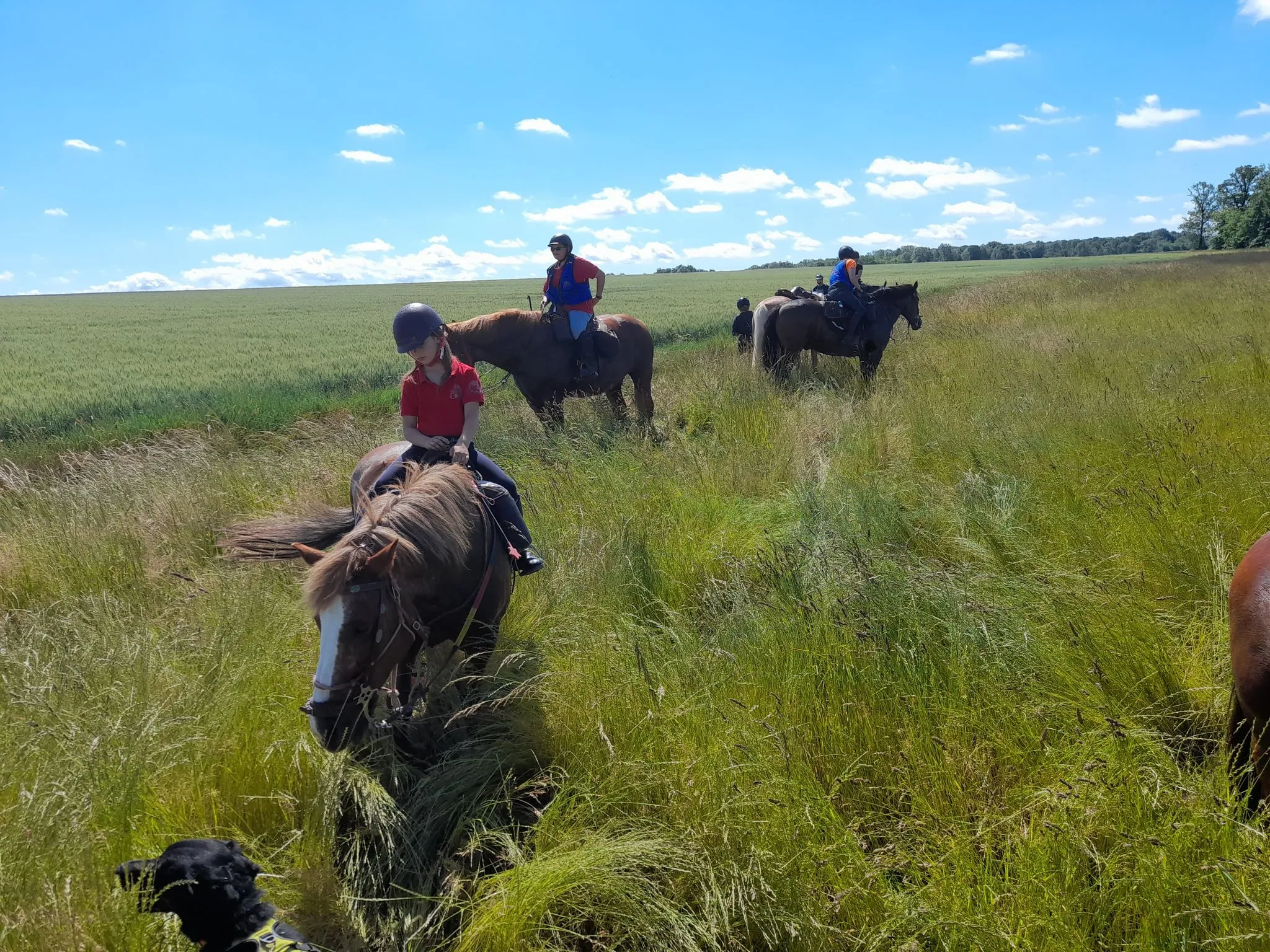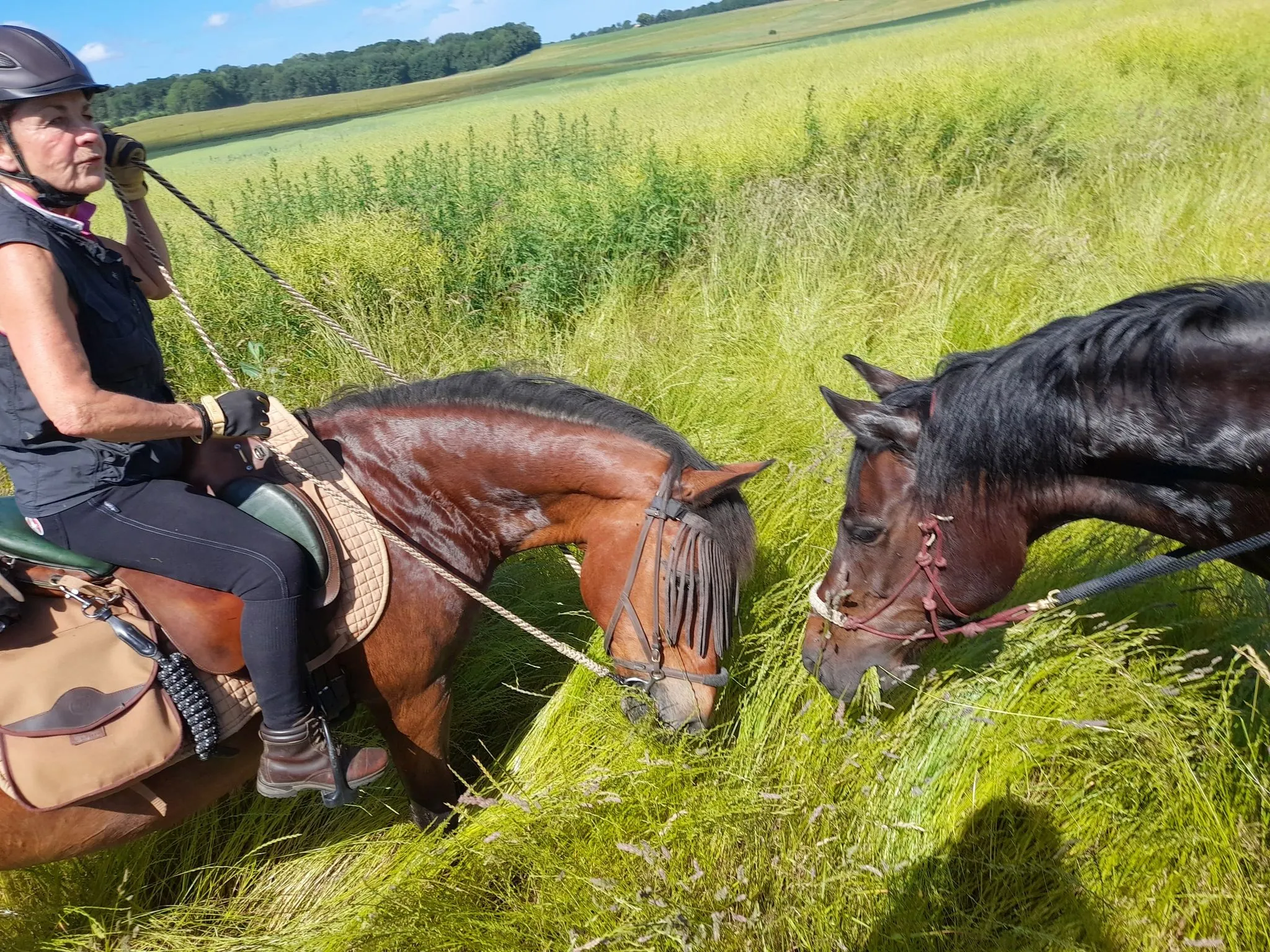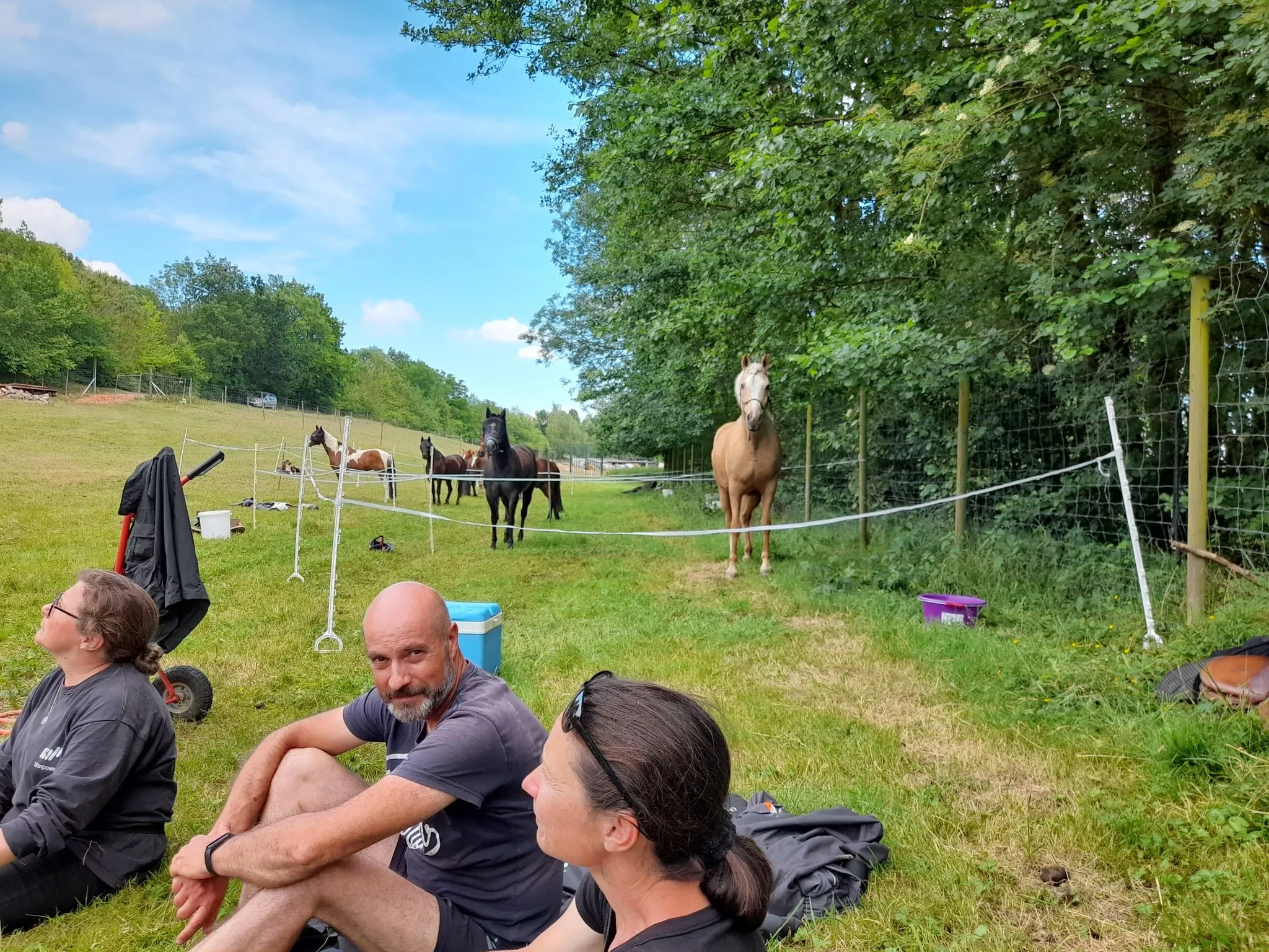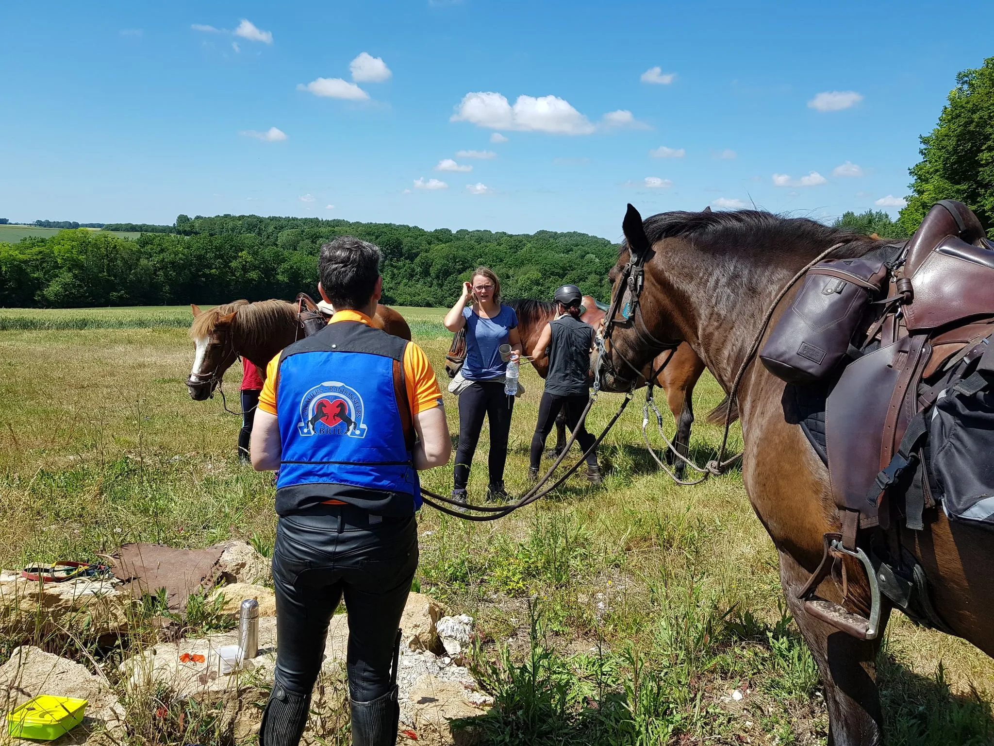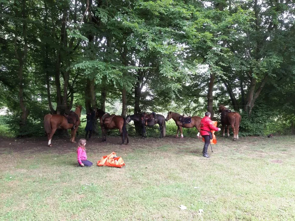 Après quelques chevauchées sur les hauteurs du plateau du grand Morin et un détour par la Commanderie de Coutran, nous pouvions rejoindre notre point de stationnement et restauration. Au menu : boissons fraiches, grillades et tartes aux pommes. Un agréable moment passé à coté de nos chevaux, à l’ombre au bord du grand Morin. Un grand merci à M. et Mme G pour la mise à disposition de leur pré.