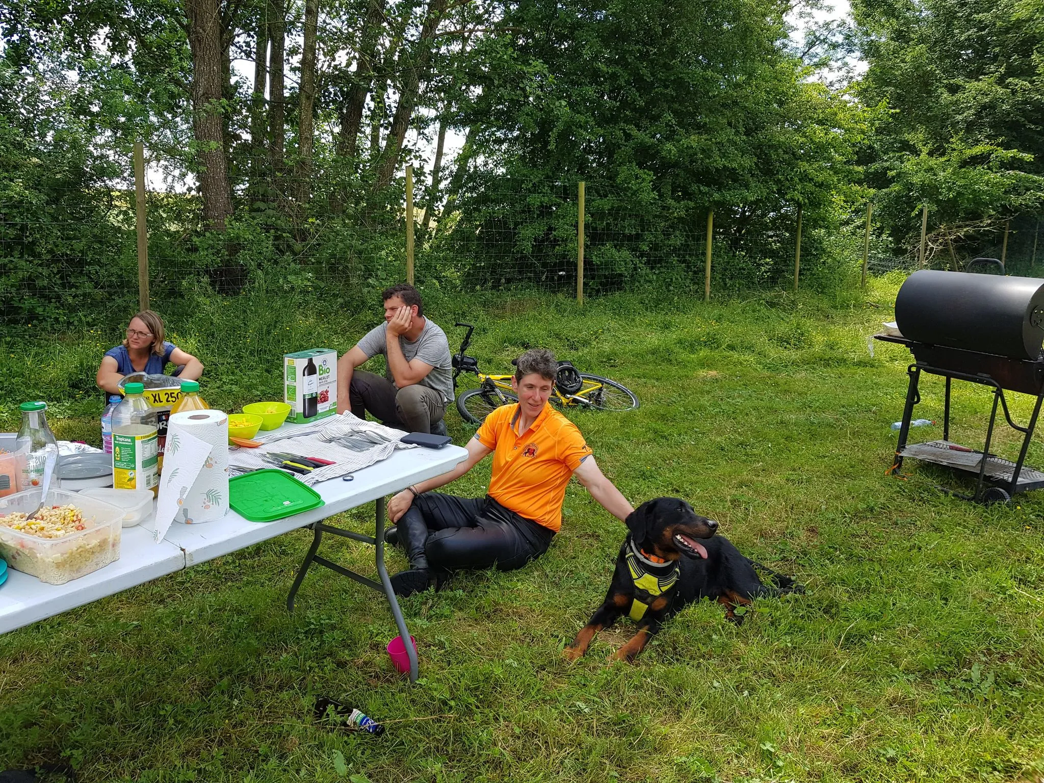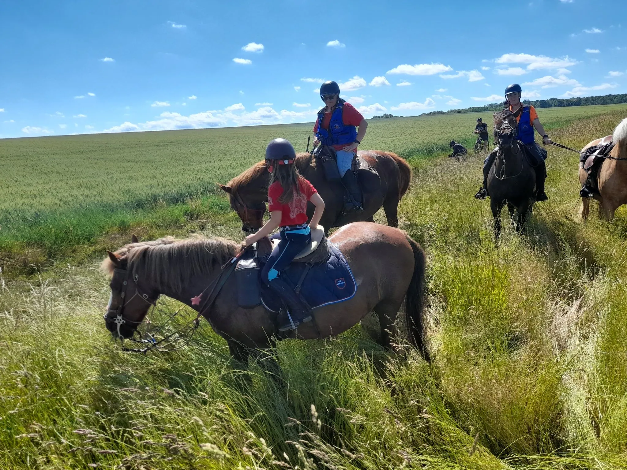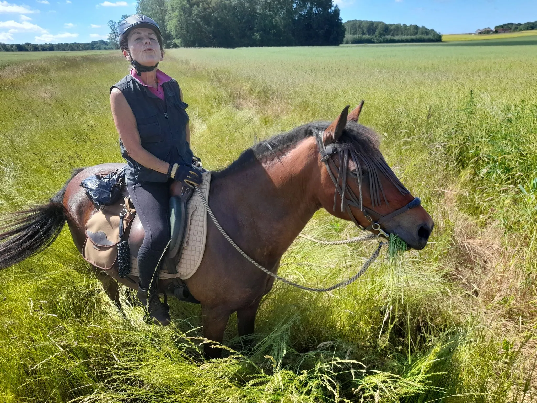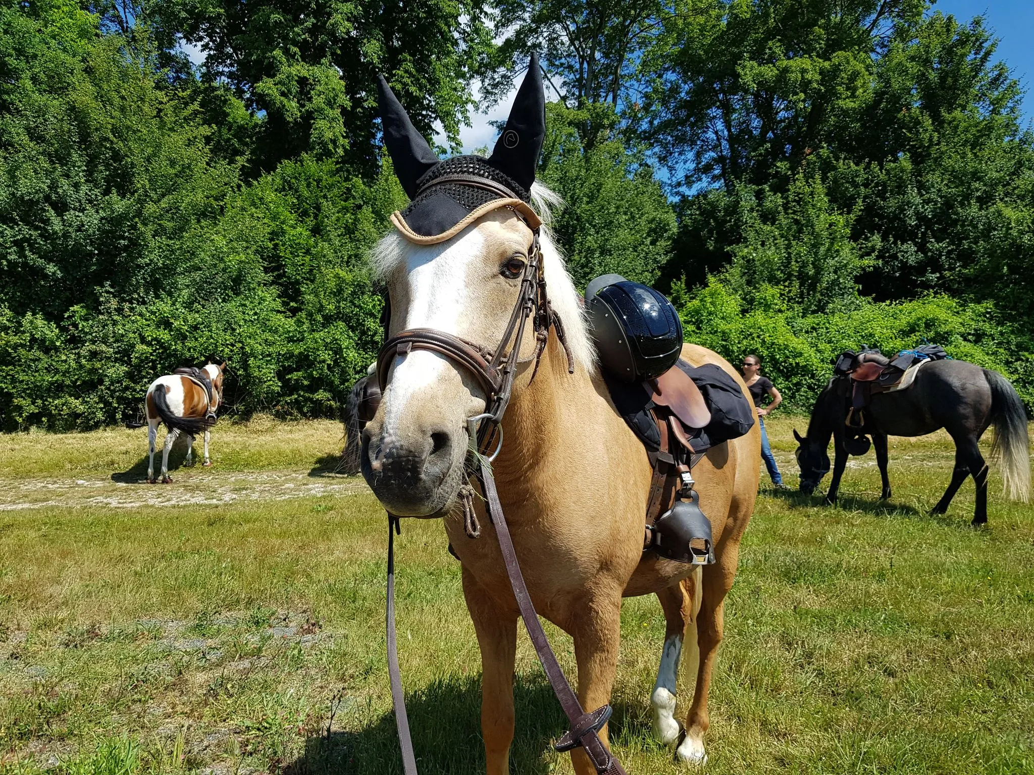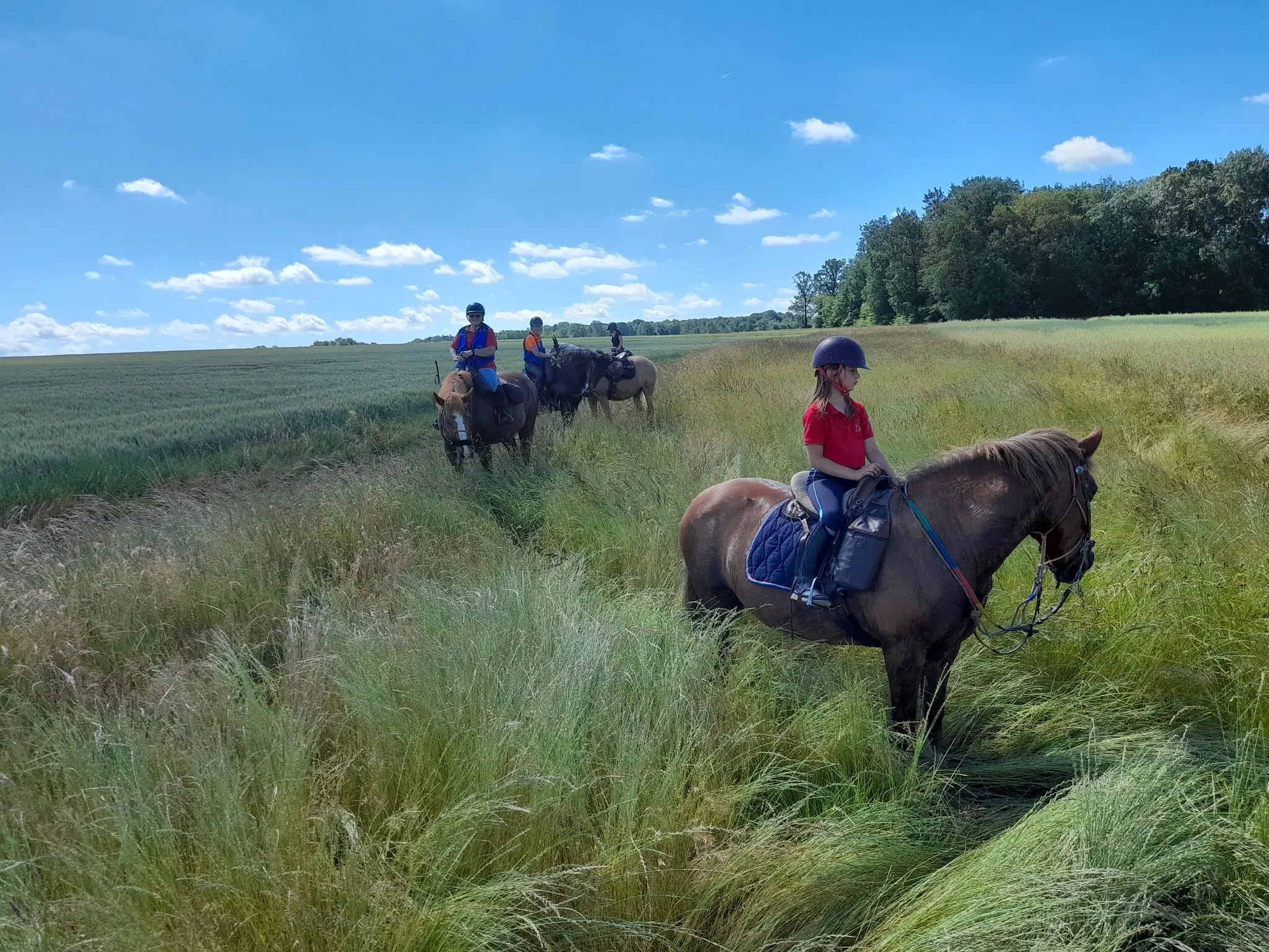 Après quelques chevauchées sur les hauteurs du plateau du grand Morin et un détour par la Commanderie de Coutran, nous pouvions rejoindre notre point de stationnement et restauration. Au menu : boissons fraiches, grillades et tartes aux pommes. Un agréable moment passé à coté de nos chevaux, à l’ombre au bord du grand Morin. Un grand merci à M. et Mme G pour la mise à disposition de leur pré.