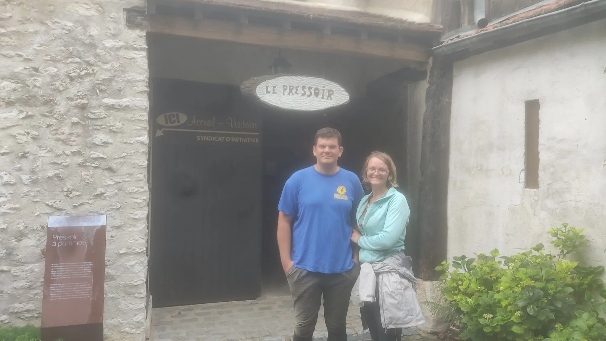 Monsieur le Maire et Sylvie, une résidente de la commune, nous accueillaient pour la visite du pressoir.